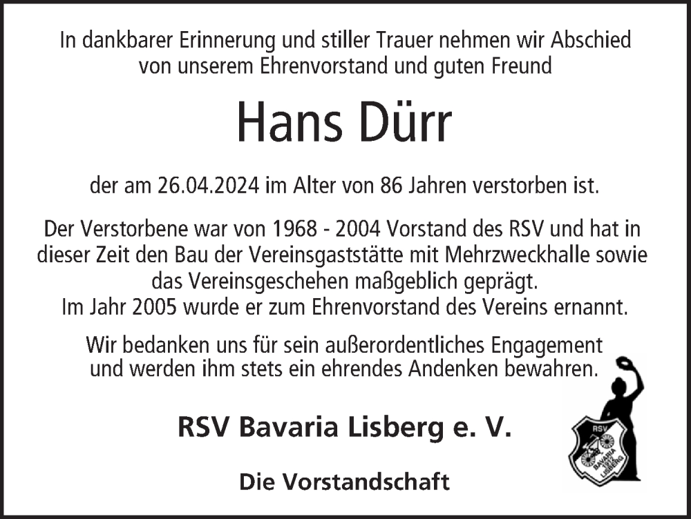Hier finden Sie alle Traueranzeigen aus der Zeitung, die bisher für Hans Dürr erschienen sind. Weitere Traueranzeigen, die in der Zeitung erscheinen, werden hier ebenfalls aufgelistet