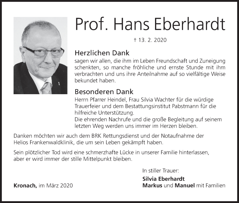 Hier finden Sie alle Traueranzeigen aus der Zeitung, die bisher für Hans Eberhardt erschienen sind. Weitere Traueranzeigen, die in der Zeitung erscheinen, werden hier ebenfalls aufgelistet