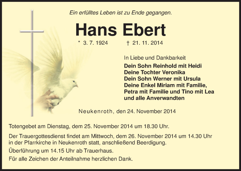 Hier finden Sie alle Traueranzeigen aus der Zeitung, die bisher für Hans Ebert erschienen sind. Weitere Traueranzeigen, die in der Zeitung erscheinen, werden hier ebenfalls aufgelistet