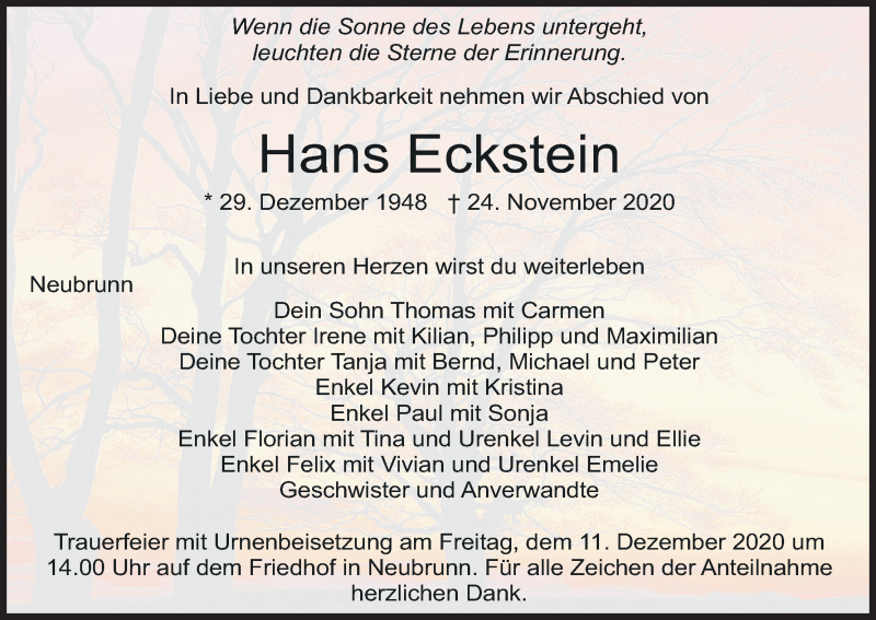 Hier finden Sie alle Traueranzeigen aus der Zeitung, die bisher für Hans Eckstein erschienen sind. Weitere Traueranzeigen, die in der Zeitung erscheinen, werden hier ebenfalls aufgelistet