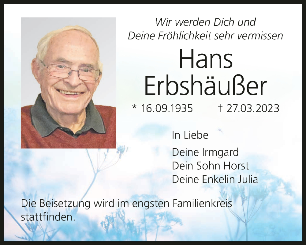 Hier finden Sie alle Traueranzeigen aus der Zeitung, die bisher für Hans Erbshäußer erschienen sind. Weitere Traueranzeigen, die in der Zeitung erscheinen, werden hier ebenfalls aufgelistet