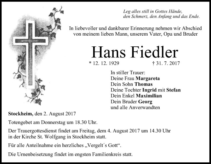 Hier finden Sie alle Traueranzeigen aus der Zeitung, die bisher für Hans Fiedler erschienen sind. Weitere Traueranzeigen, die in der Zeitung erscheinen, werden hier ebenfalls aufgelistet