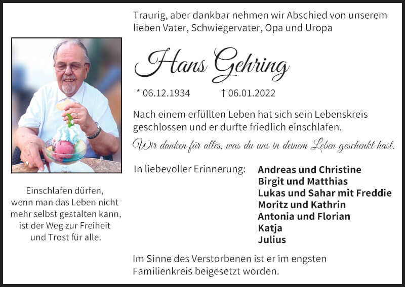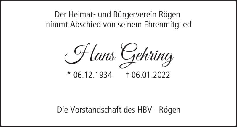 Hier finden Sie alle Traueranzeigen aus der Zeitung, die bisher für Hans Gehring erschienen sind. Weitere Traueranzeigen, die in der Zeitung erscheinen, werden hier ebenfalls aufgelistet