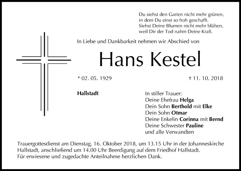 Hier finden Sie alle Traueranzeigen aus der Zeitung, die bisher für Hans Kestel erschienen sind. Weitere Traueranzeigen, die in der Zeitung erscheinen, werden hier ebenfalls aufgelistet
