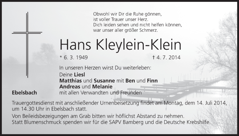 Hier finden Sie alle Traueranzeigen aus der Zeitung, die bisher für Hans Kleylein-Klein erschienen sind. Weitere Traueranzeigen, die in der Zeitung erscheinen, werden hier ebenfalls aufgelistet