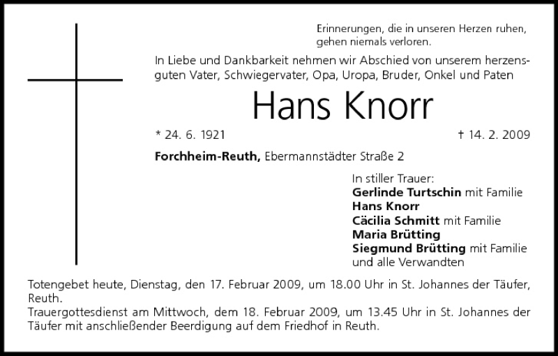 Hier finden Sie alle Traueranzeigen aus der Zeitung, die bisher für Hans Knorr erschienen sind. Weitere Traueranzeigen, die in der Zeitung erscheinen, werden hier ebenfalls aufgelistet
