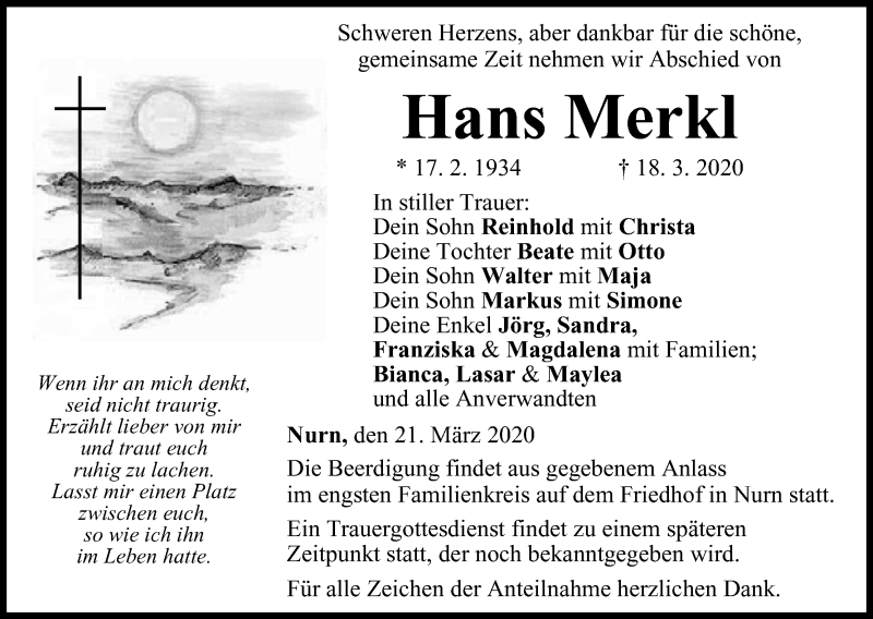 Hier finden Sie alle Traueranzeigen aus der Zeitung, die bisher für Hans Merkl erschienen sind. Weitere Traueranzeigen, die in der Zeitung erscheinen, werden hier ebenfalls aufgelistet