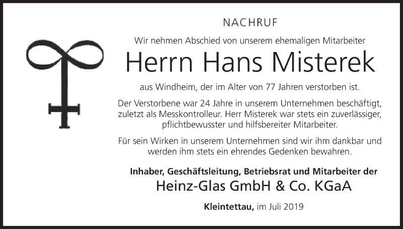 Hier finden Sie alle Traueranzeigen aus der Zeitung, die bisher für Hans Misterek erschienen sind. Weitere Traueranzeigen, die in der Zeitung erscheinen, werden hier ebenfalls aufgelistet