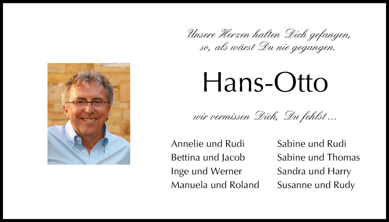 Hier finden Sie alle Traueranzeigen aus der Zeitung, die bisher für Hans-Otto erschienen sind. Weitere Traueranzeigen, die in der Zeitung erscheinen, werden hier ebenfalls aufgelistet