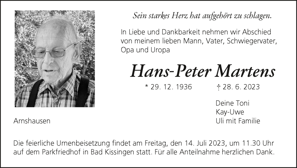 Hier finden Sie alle Traueranzeigen aus der Zeitung, die bisher für Hans-Peter Martens erschienen sind. Weitere Traueranzeigen, die in der Zeitung erscheinen, werden hier ebenfalls aufgelistet