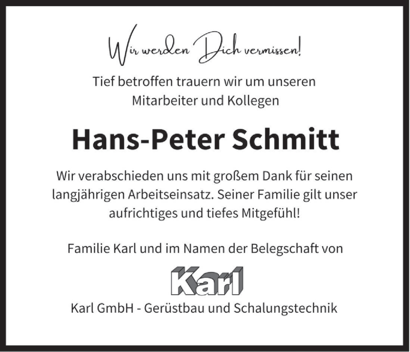 Hier finden Sie alle Traueranzeigen aus der Zeitung, die bisher für Hans-Peter Schmitt erschienen sind. Weitere Traueranzeigen, die in der Zeitung erscheinen, werden hier ebenfalls aufgelistet