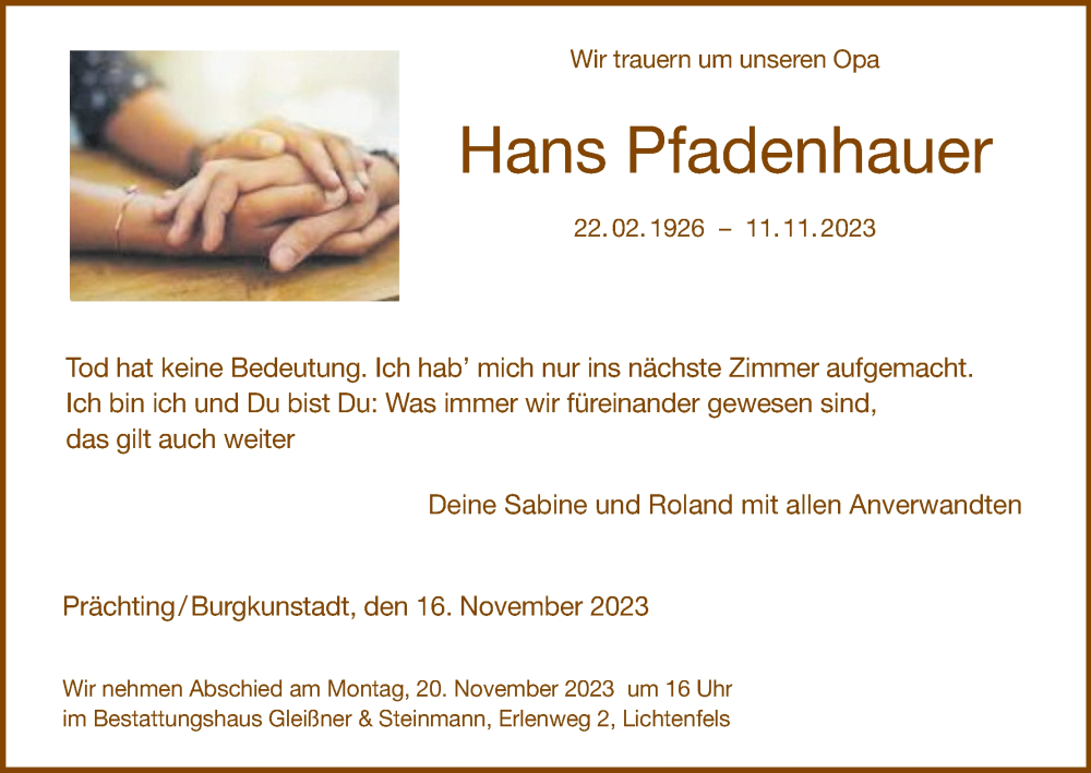 Hier finden Sie alle Traueranzeigen aus der Zeitung, die bisher für Hans Pfadenhauer erschienen sind. Weitere Traueranzeigen, die in der Zeitung erscheinen, werden hier ebenfalls aufgelistet