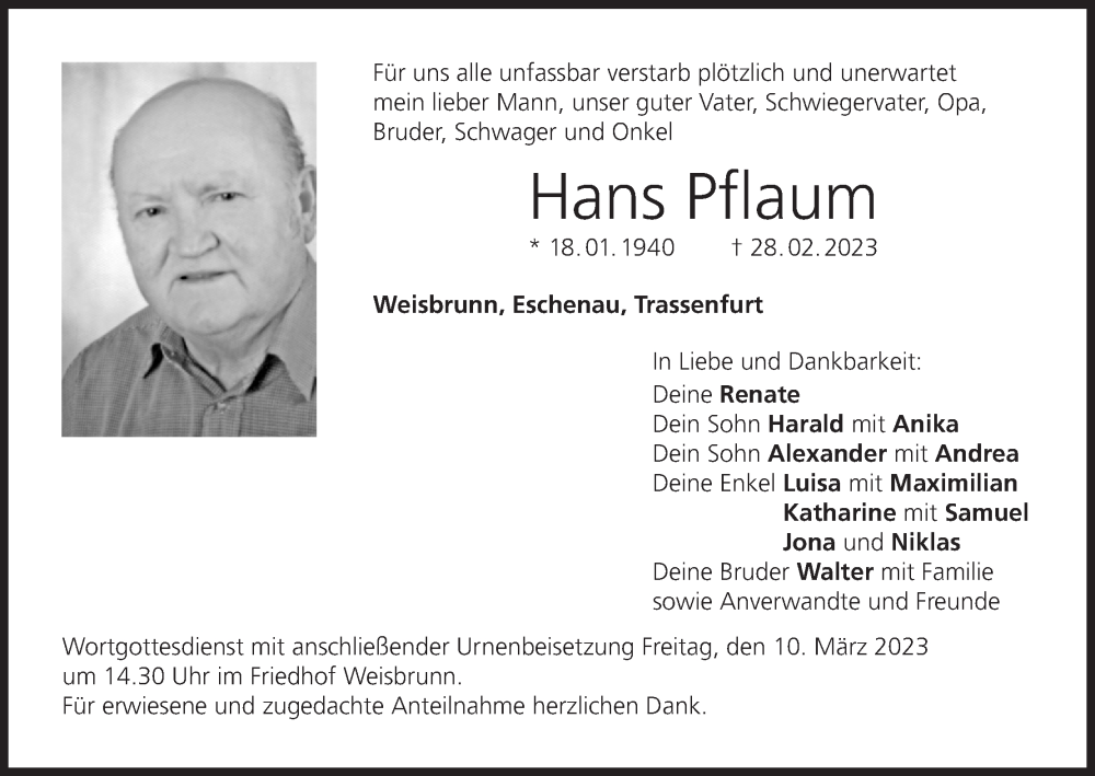 Hier finden Sie alle Traueranzeigen aus der Zeitung, die bisher für Hans Pflaum erschienen sind. Weitere Traueranzeigen, die in der Zeitung erscheinen, werden hier ebenfalls aufgelistet