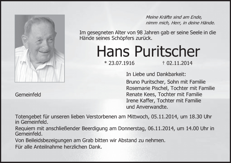 Hier finden Sie alle Traueranzeigen aus der Zeitung, die bisher für Hans Puritscher erschienen sind. Weitere Traueranzeigen, die in der Zeitung erscheinen, werden hier ebenfalls aufgelistet