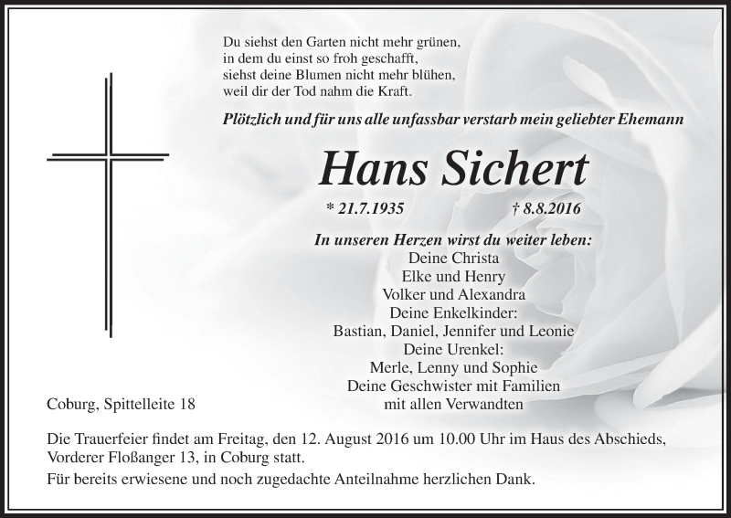 Hier finden Sie alle Traueranzeigen aus der Zeitung, die bisher für Hans Sichert erschienen sind. Weitere Traueranzeigen, die in der Zeitung erscheinen, werden hier ebenfalls aufgelistet