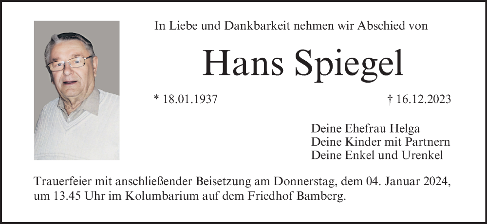 Hier finden Sie alle Traueranzeigen aus der Zeitung, die bisher für Hans Spiegel erschienen sind. Weitere Traueranzeigen, die in der Zeitung erscheinen, werden hier ebenfalls aufgelistet