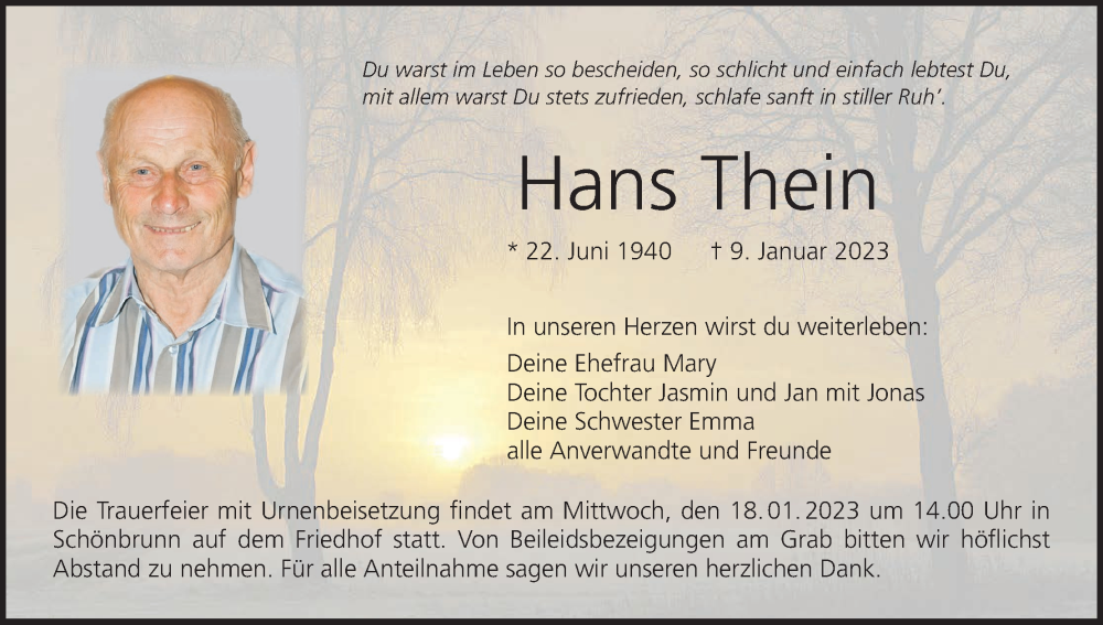 Hier finden Sie alle Traueranzeigen aus der Zeitung, die bisher für Hans Thein erschienen sind. Weitere Traueranzeigen, die in der Zeitung erscheinen, werden hier ebenfalls aufgelistet