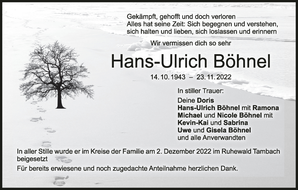 Hier finden Sie alle Traueranzeigen aus der Zeitung, die bisher für Hans-Ulrich Böhnel erschienen sind. Weitere Traueranzeigen, die in der Zeitung erscheinen, werden hier ebenfalls aufgelistet