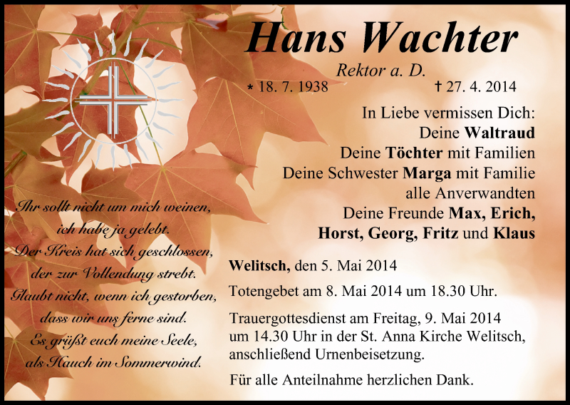 Hier finden Sie alle Traueranzeigen aus der Zeitung, die bisher für Hans Wachter erschienen sind. Weitere Traueranzeigen, die in der Zeitung erscheinen, werden hier ebenfalls aufgelistet
