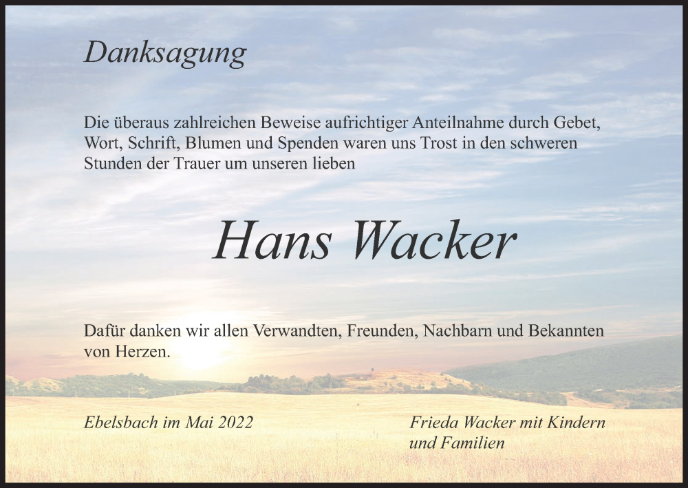 Hier finden Sie alle Traueranzeigen aus der Zeitung, die bisher für Hans Wacker erschienen sind. Weitere Traueranzeigen, die in der Zeitung erscheinen, werden hier ebenfalls aufgelistet