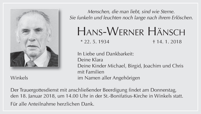 Hier finden Sie alle Traueranzeigen aus der Zeitung, die bisher für Hans-werner Hänsch erschienen sind. Weitere Traueranzeigen, die in der Zeitung erscheinen, werden hier ebenfalls aufgelistet