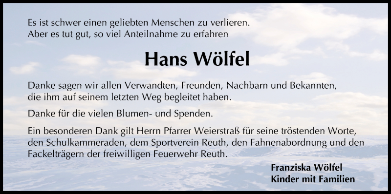 Hier finden Sie alle Traueranzeigen aus der Zeitung, die bisher für Hans Wölfel erschienen sind. Weitere Traueranzeigen, die in der Zeitung erscheinen, werden hier ebenfalls aufgelistet