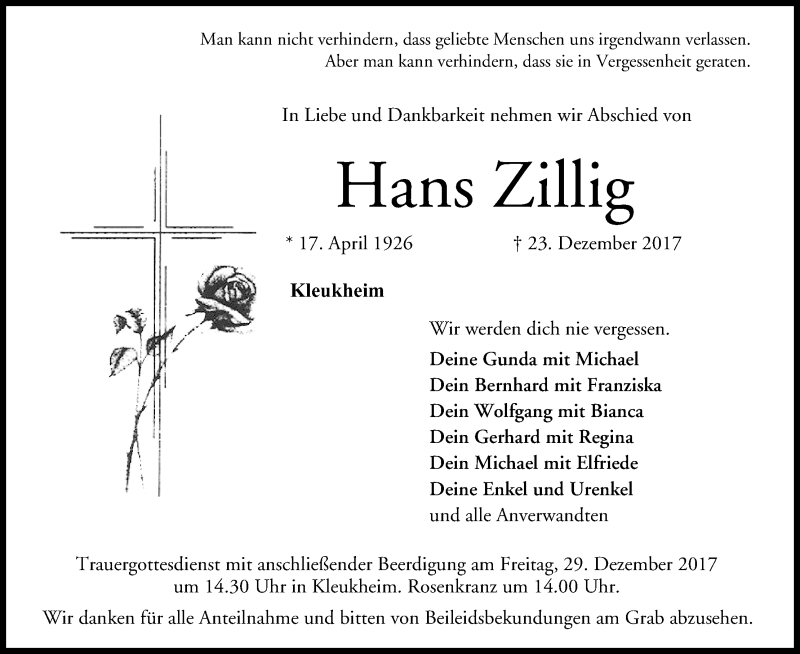 Hier finden Sie alle Traueranzeigen aus der Zeitung, die bisher für Hans Zillig erschienen sind. Weitere Traueranzeigen, die in der Zeitung erscheinen, werden hier ebenfalls aufgelistet