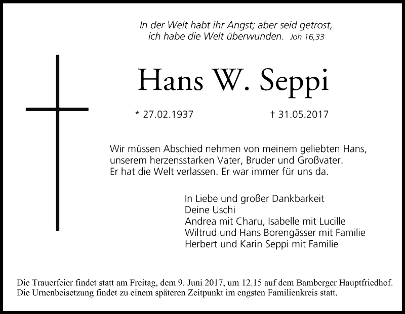Hier finden Sie alle Traueranzeigen aus der Zeitung, die bisher für Hans W. Seppi erschienen sind. Weitere Traueranzeigen, die in der Zeitung erscheinen, werden hier ebenfalls aufgelistet