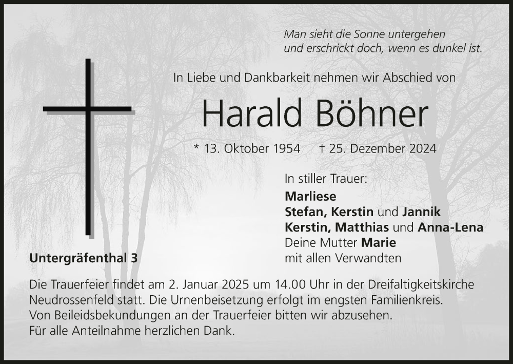 Hier finden Sie alle Traueranzeigen aus der Zeitung, die bisher für Harald Böhner erschienen sind. Weitere Traueranzeigen, die in der Zeitung erscheinen, werden hier ebenfalls aufgelistet