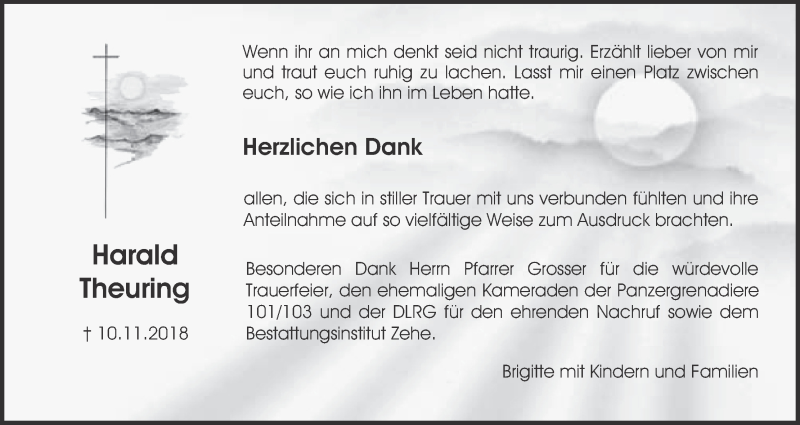 Hier finden Sie alle Traueranzeigen aus der Zeitung, die bisher für Harald Theuring erschienen sind. Weitere Traueranzeigen, die in der Zeitung erscheinen, werden hier ebenfalls aufgelistet