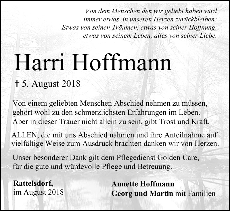 Hier finden Sie alle Traueranzeigen aus der Zeitung, die bisher für Harri Hoffmann erschienen sind. Weitere Traueranzeigen, die in der Zeitung erscheinen, werden hier ebenfalls aufgelistet