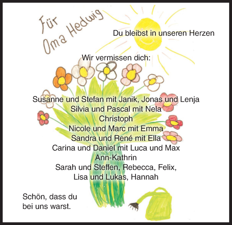 Hier finden Sie alle Traueranzeigen aus der Zeitung, die bisher für Hedwig erschienen sind. Weitere Traueranzeigen, die in der Zeitung erscheinen, werden hier ebenfalls aufgelistet