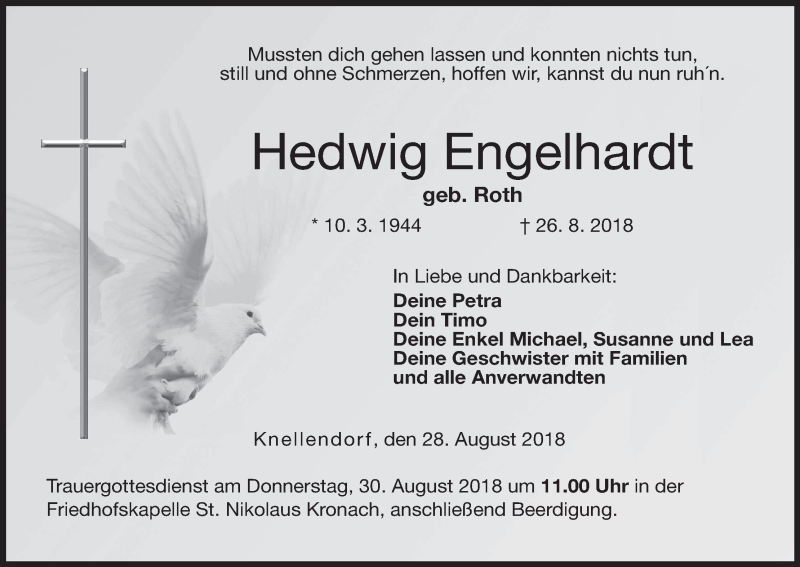 Hier finden Sie alle Traueranzeigen aus der Zeitung, die bisher für Hedwig Engelhardt erschienen sind. Weitere Traueranzeigen, die in der Zeitung erscheinen, werden hier ebenfalls aufgelistet