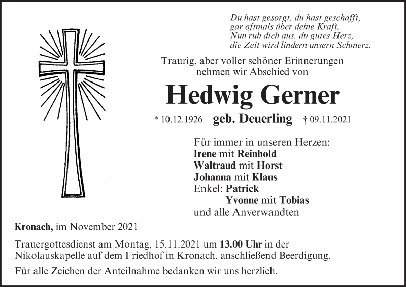 Hier finden Sie alle Traueranzeigen aus der Zeitung, die bisher für Hedwig Gerner erschienen sind. Weitere Traueranzeigen, die in der Zeitung erscheinen, werden hier ebenfalls aufgelistet