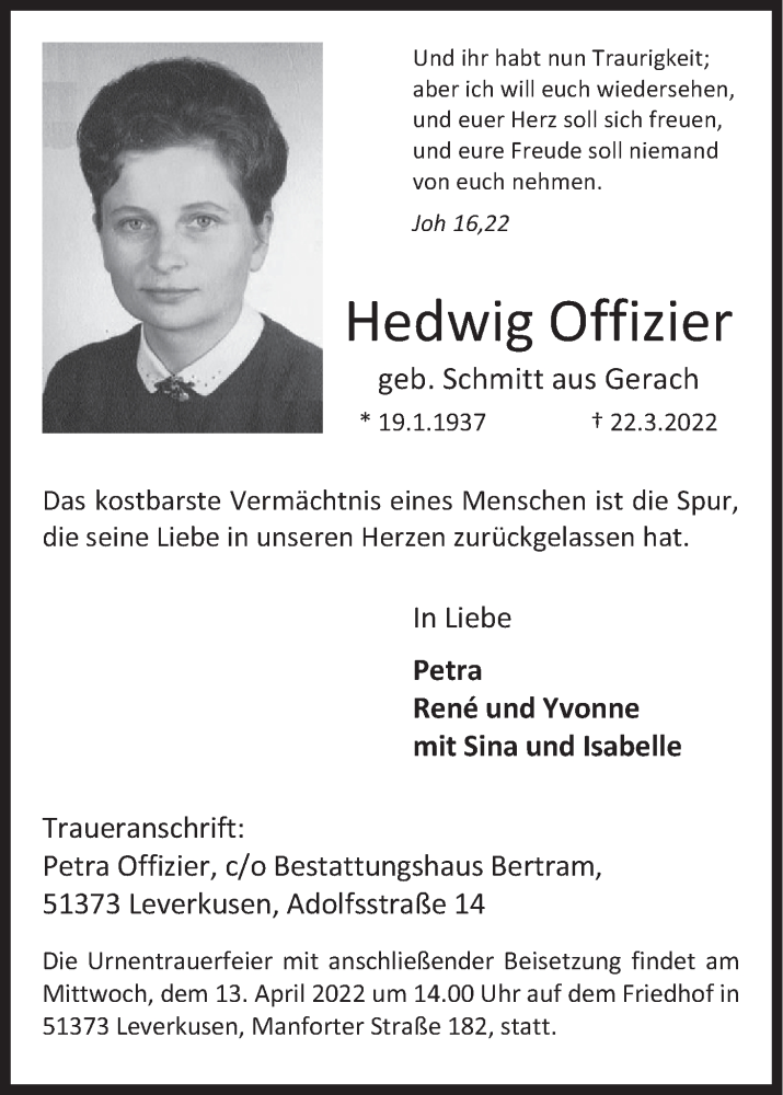 Hier finden Sie alle Traueranzeigen aus der Zeitung, die bisher für Hedwig Offizier erschienen sind. Weitere Traueranzeigen, die in der Zeitung erscheinen, werden hier ebenfalls aufgelistet
