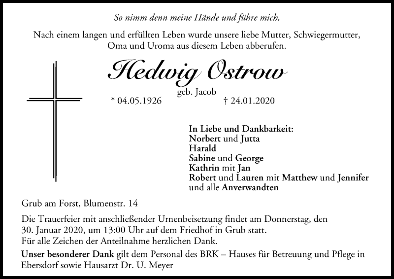 Hier finden Sie alle Traueranzeigen aus der Zeitung, die bisher für Hedwig Ostrow erschienen sind. Weitere Traueranzeigen, die in der Zeitung erscheinen, werden hier ebenfalls aufgelistet