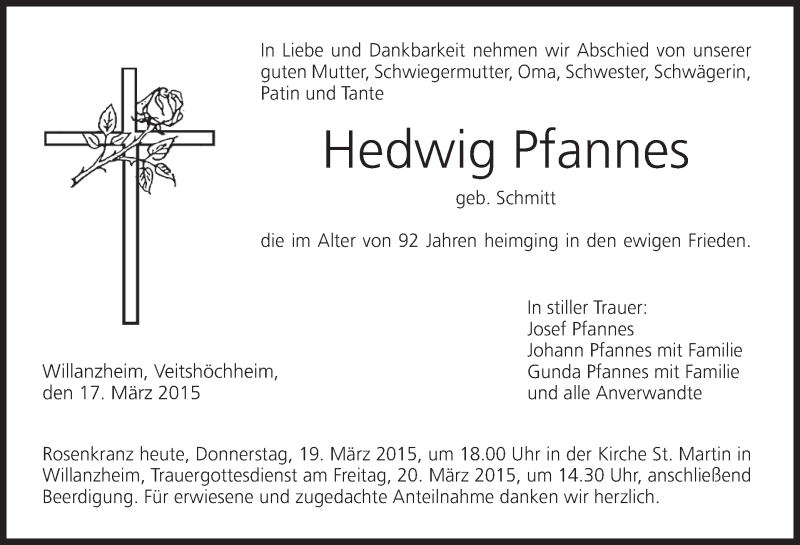 Hier finden Sie alle Traueranzeigen aus der Zeitung, die bisher für Hedwig Pfannes erschienen sind. Weitere Traueranzeigen, die in der Zeitung erscheinen, werden hier ebenfalls aufgelistet