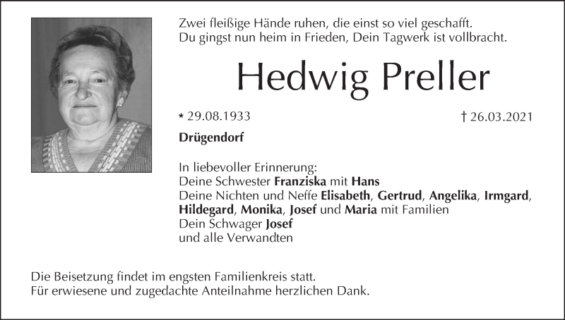 Hier finden Sie alle Traueranzeigen aus der Zeitung, die bisher für Hedwig Preller erschienen sind. Weitere Traueranzeigen, die in der Zeitung erscheinen, werden hier ebenfalls aufgelistet