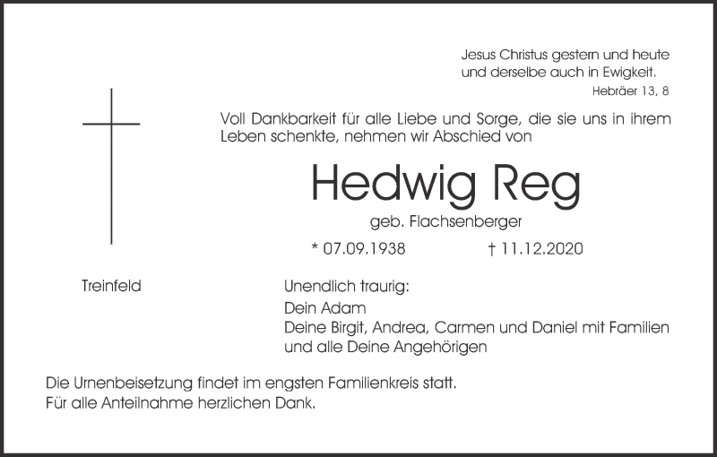 Hier finden Sie alle Traueranzeigen aus der Zeitung, die bisher für Hedwig Reg erschienen sind. Weitere Traueranzeigen, die in der Zeitung erscheinen, werden hier ebenfalls aufgelistet