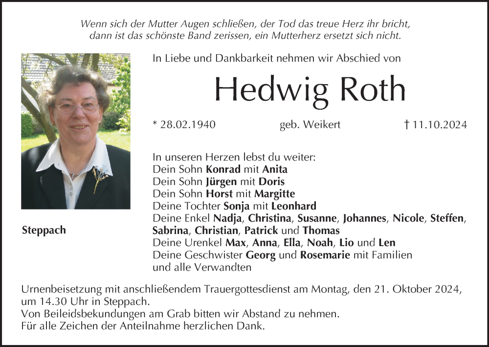 Hier finden Sie alle Traueranzeigen aus der Zeitung, die bisher für Hedwig Roth erschienen sind. Weitere Traueranzeigen, die in der Zeitung erscheinen, werden hier ebenfalls aufgelistet