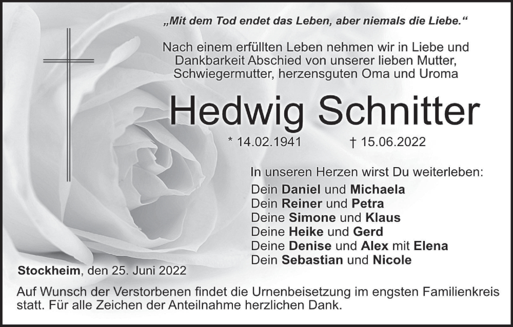Hier finden Sie alle Traueranzeigen aus der Zeitung, die bisher für Hedwig Schnitter erschienen sind. Weitere Traueranzeigen, die in der Zeitung erscheinen, werden hier ebenfalls aufgelistet