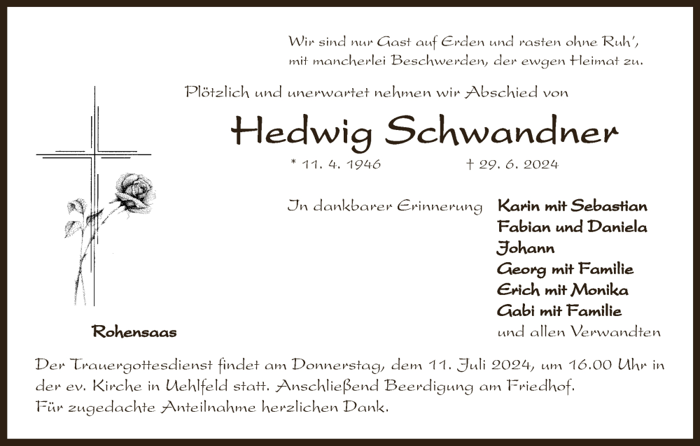 Hier finden Sie alle Traueranzeigen aus der Zeitung, die bisher für Hedwig Schwandner erschienen sind. Weitere Traueranzeigen, die in der Zeitung erscheinen, werden hier ebenfalls aufgelistet