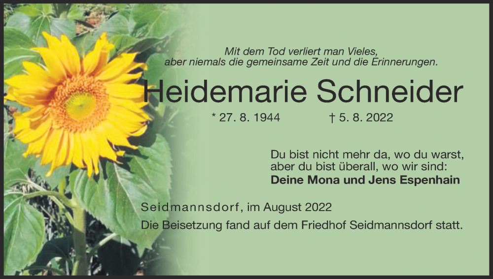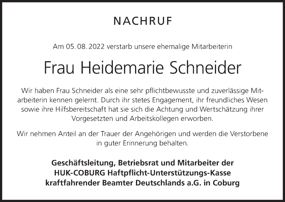 Hier finden Sie alle Traueranzeigen aus der Zeitung, die bisher für Heidemarie Schneider erschienen sind. Weitere Traueranzeigen, die in der Zeitung erscheinen, werden hier ebenfalls aufgelistet