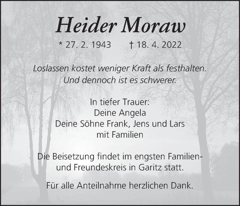 Hier finden Sie alle Traueranzeigen aus der Zeitung, die bisher für Heider Moraw erschienen sind. Weitere Traueranzeigen, die in der Zeitung erscheinen, werden hier ebenfalls aufgelistet