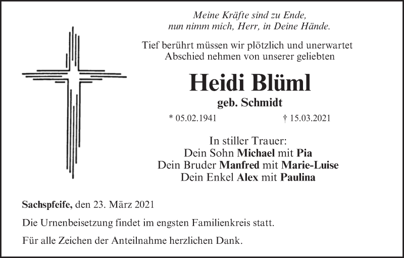 Hier finden Sie alle Traueranzeigen aus der Zeitung, die bisher für Heidi Blüml erschienen sind. Weitere Traueranzeigen, die in der Zeitung erscheinen, werden hier ebenfalls aufgelistet