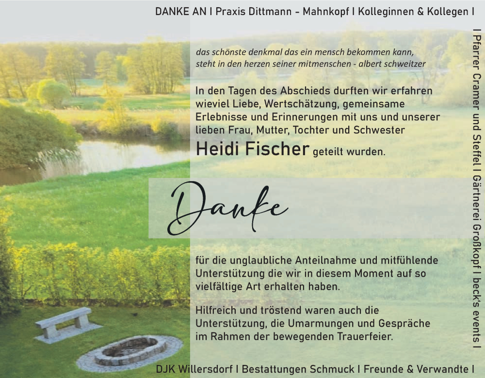 Hier finden Sie alle Traueranzeigen aus der Zeitung, die bisher für Heidi Fischer erschienen sind. Weitere Traueranzeigen, die in der Zeitung erscheinen, werden hier ebenfalls aufgelistet