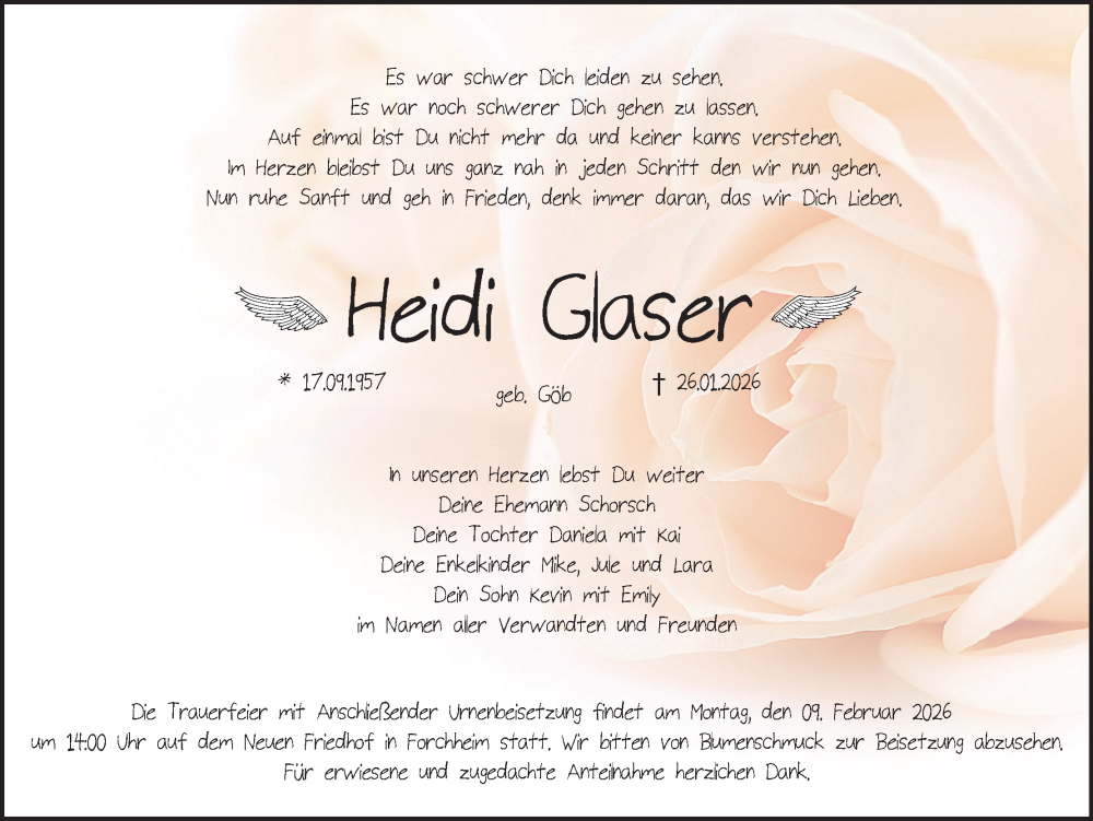 Hier finden Sie alle Traueranzeigen aus der Zeitung, die bisher für Heidi Glaser erschienen sind. Weitere Traueranzeigen, die in der Zeitung erscheinen, werden hier ebenfalls aufgelistet