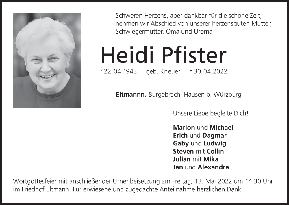 Hier finden Sie alle Traueranzeigen aus der Zeitung, die bisher für Heidi Pfister erschienen sind. Weitere Traueranzeigen, die in der Zeitung erscheinen, werden hier ebenfalls aufgelistet