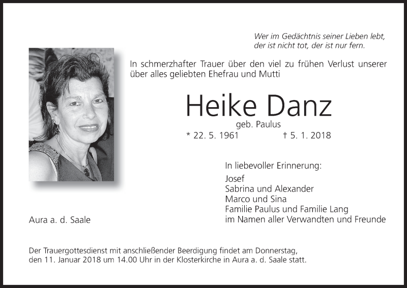 Hier finden Sie alle Traueranzeigen aus der Zeitung, die bisher für Heike Danz erschienen sind. Weitere Traueranzeigen, die in der Zeitung erscheinen, werden hier ebenfalls aufgelistet