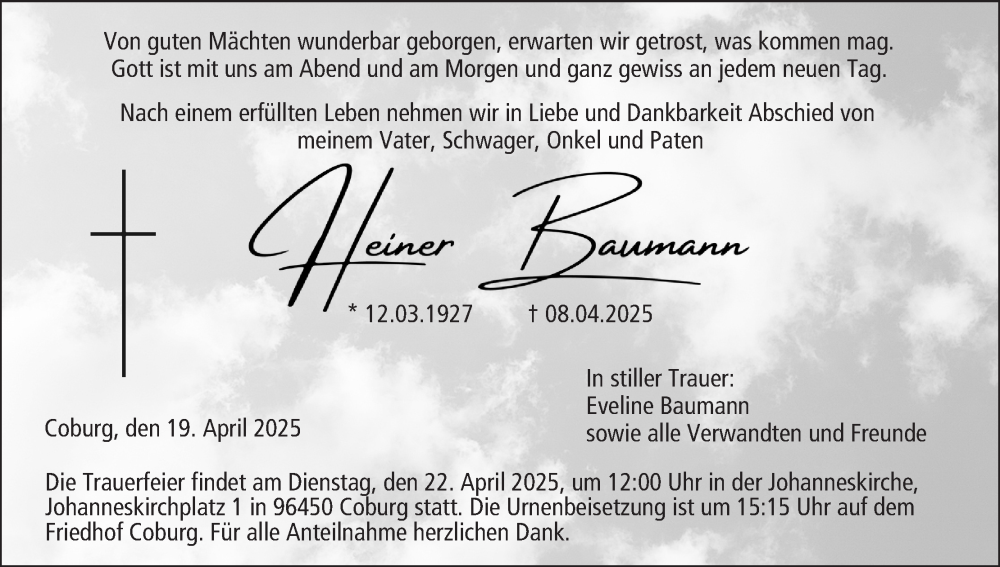Hier finden Sie alle Traueranzeigen aus der Zeitung, die bisher für Heiner Baumann erschienen sind. Weitere Traueranzeigen, die in der Zeitung erscheinen, werden hier ebenfalls aufgelistet